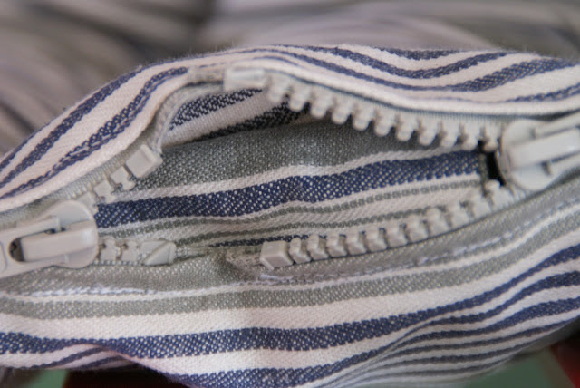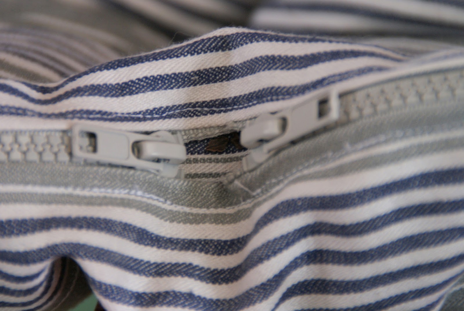 Jag sydde in två dragkedjor som möts på mitten längs ena långsidan. ( Men kunde likväl ha sytt in en lika lång dragkedja som madrassen, detta skulle vara smidigare, men tyvärr hade jag ingen så lång dragkedja).