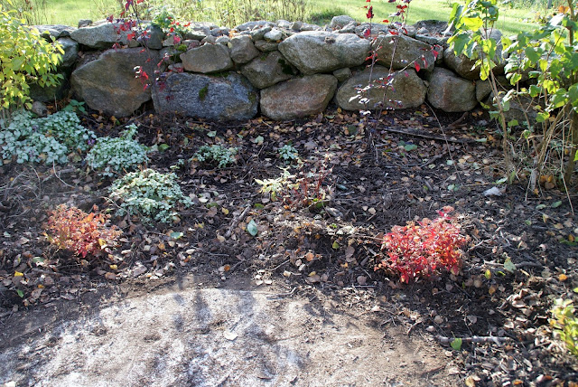 Bilden ovan har varit en lövkompost mot en stenmur, men nu när komposten har förmultnat har jag gjort en en lättsköttbuskrabatt här. Den är precis intill trädgårdslandet, så de är hit man går och sätter sig, dricker ett glas saft och samlar krafter efter att ha jobbat i trädgårdslandet. De är även hönornas favorit krafs ställe, så ja har planterat rosenpilister som marktäckare, den sprider sig fort så förhoppningsvis hinner inte hönorna krafsa bort all fin jord.